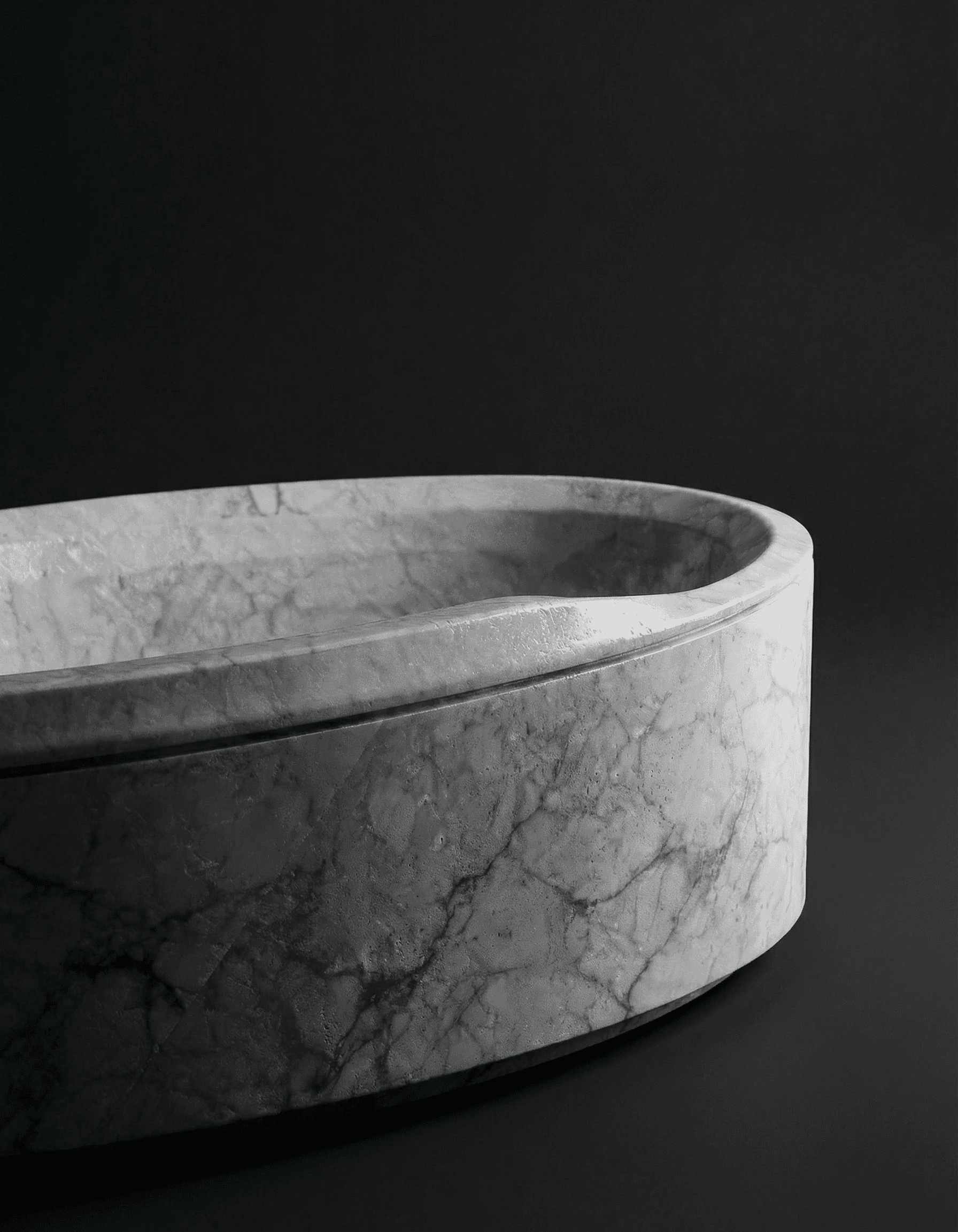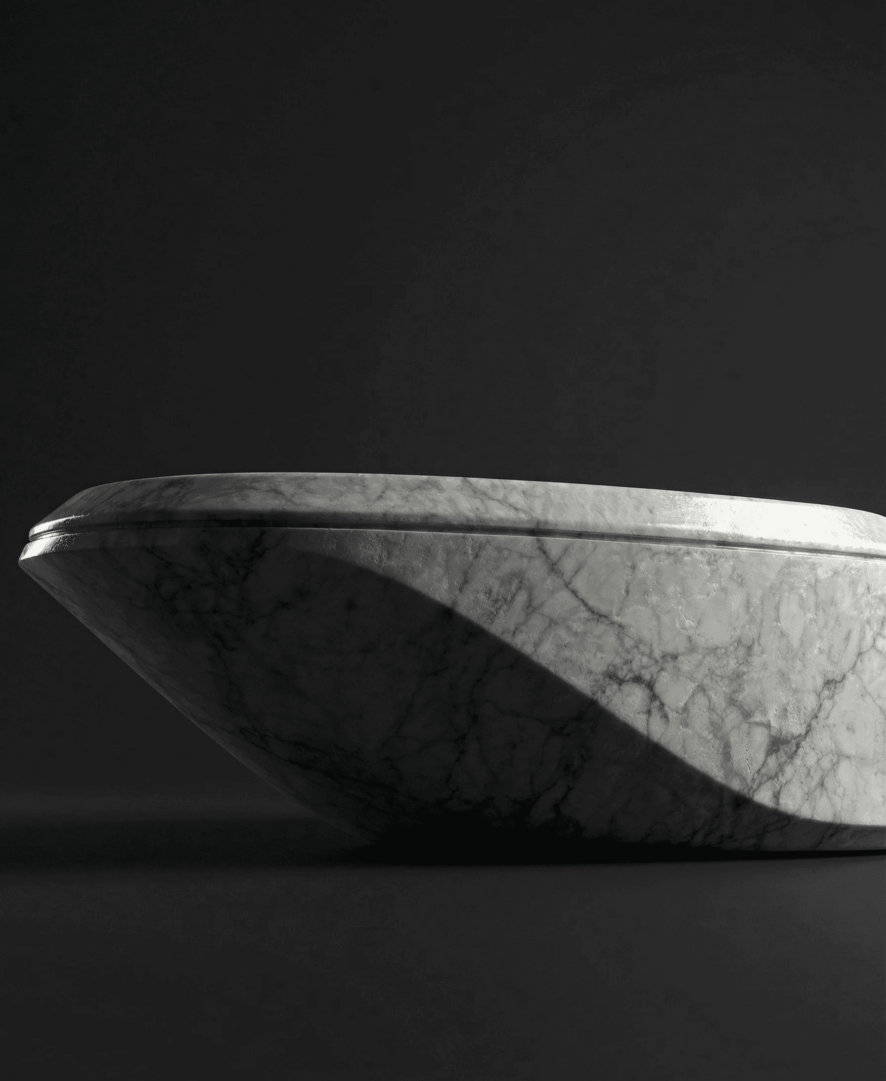 The Flux Bathtub proposes deliberate asymmetry and directional form. Its exterior, defined by sharp creases and angular tension, situates the piece as an active presence within its architectural context. In contrast, its interior surfaces with soft, controlled curvature, creating a tactile sanctuary that invites the body into a state of introspection. This duality of sharpness and softness embodies a sense of transition, transforming the act of bathing into a purposeful journey from external rigidity to internal serenity. Unlike neutral or symmetrical designs that blend passively into their surroundings, Flux asserts itself with a sense of movement, guiding both perception and experience along its sculpted contours—a progression from formal precision to intimate embrace. As a spatial intervention, Flux functions as both vessel and statement, its asymmetry and directionality challenging static conventions. It celebrates the fluidity of experience and space, embodying the ever-shifting interplay between form, function, and the human desire for renewal.